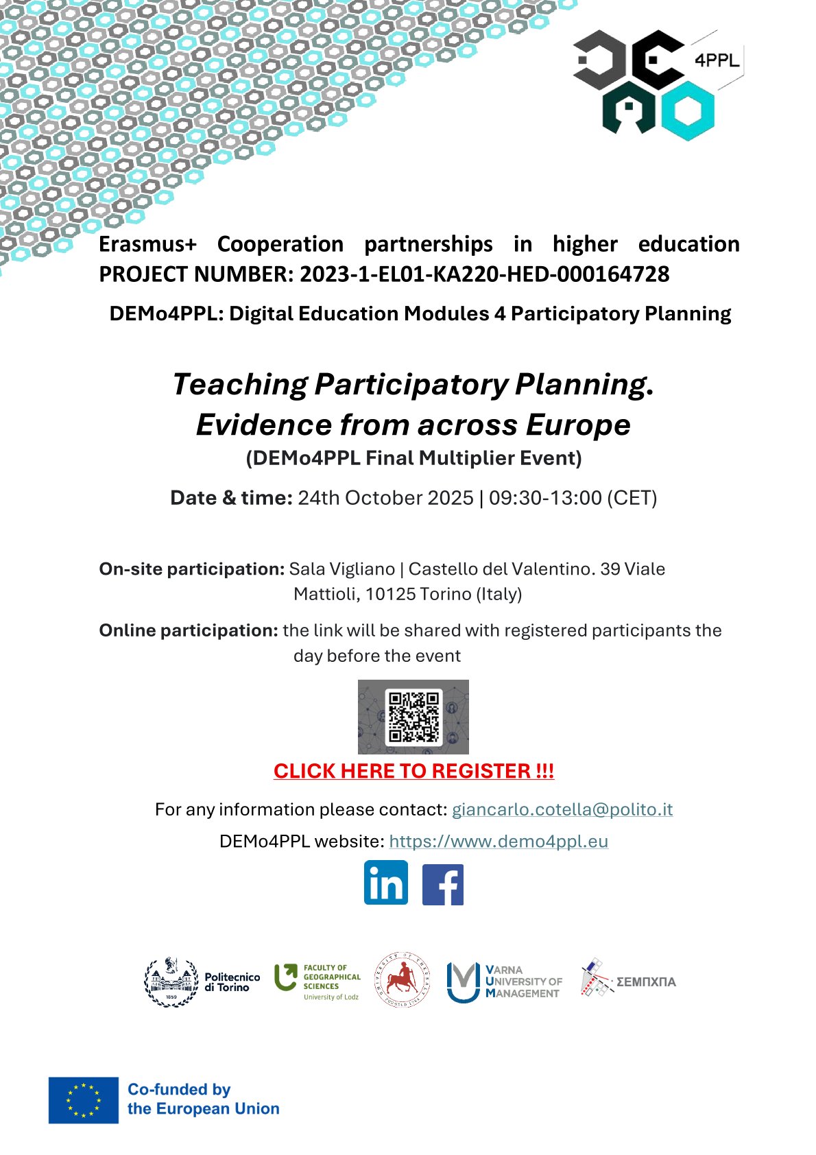 The DEMo4PPL: Digital Education Modules 4 Participatory Planning Final Multiplier Event, titled “Teaching Participatory Planning: Evidence from across Europe,” will take place on October 24, 2025, from 09:30 to 13:00 CET. The event is hosted on-site at Sala Vigliano, Castello del Valentino (39 Viale Mattioli, 10125) in Torino, Italy, and will also be accessible online (a link will be shared with registered participants the day before the event).